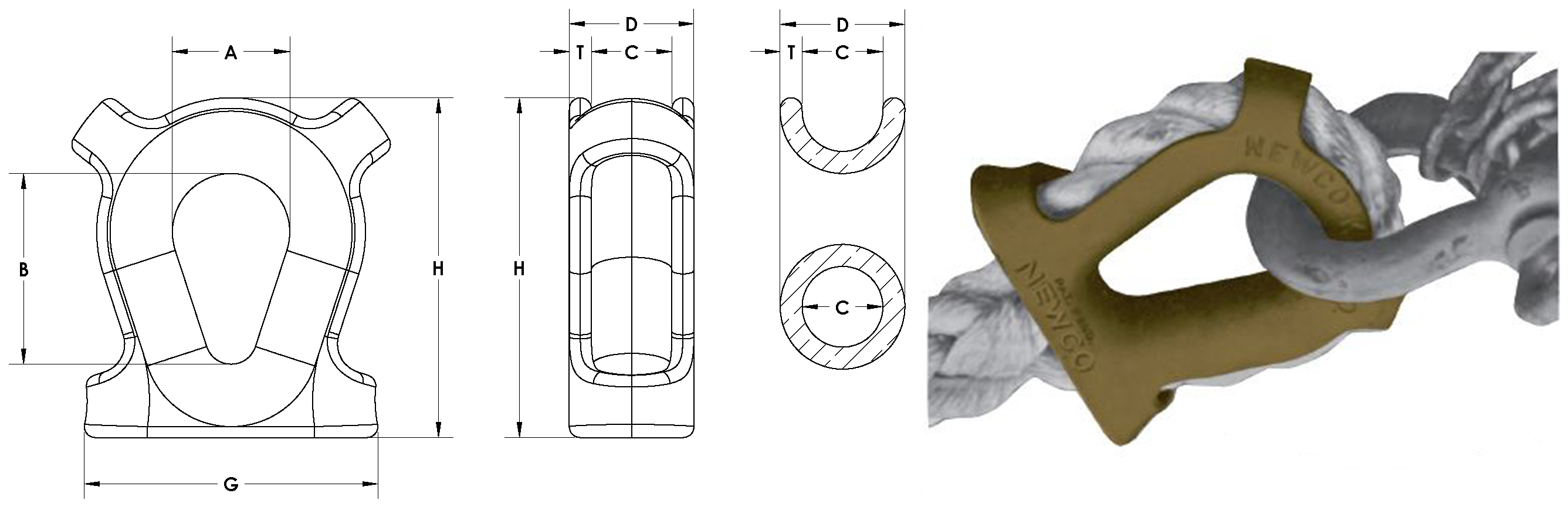 | Stock No. | Rope Circum. | Rope Dia. | A | B | C | D | G | H | T | Shackle Size | EST. WT. LBS. |